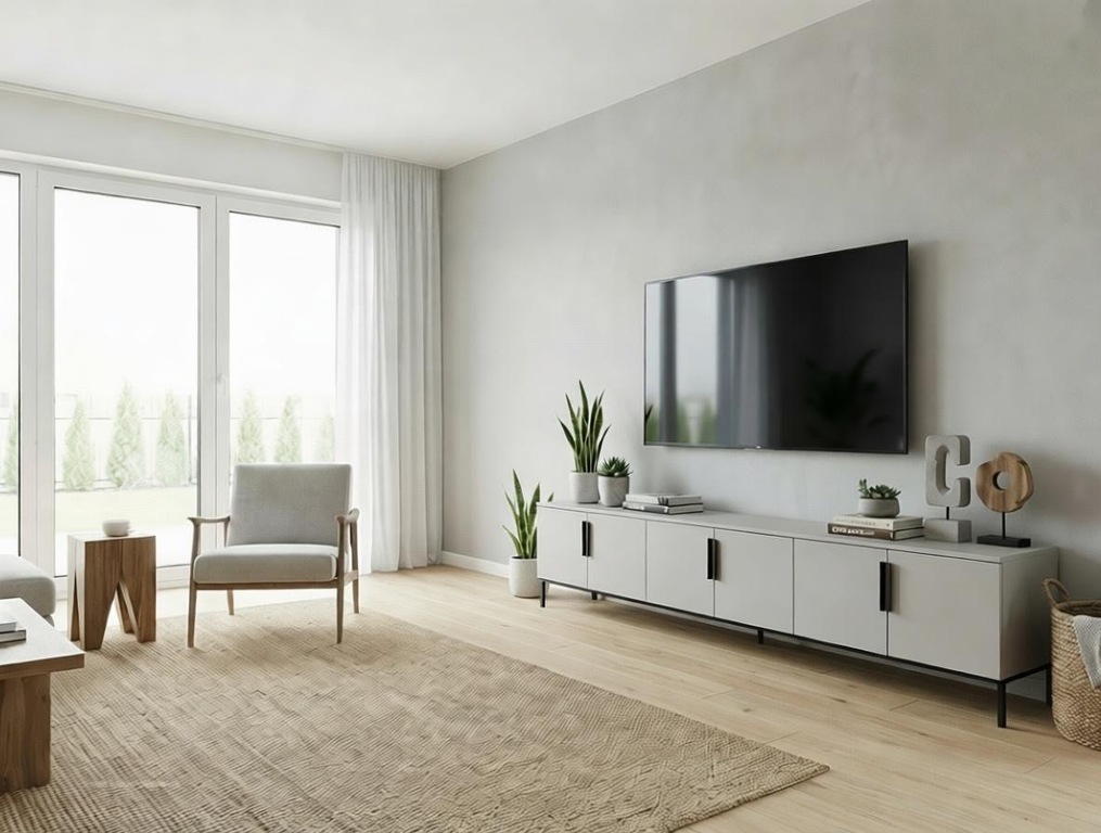 Dużym atutem nieruchomości są duże przeszklenia, które bardzo dobrze doświetlają wnętrza nie tylko w salonie, ale również w pozostałych częściach domu. Dzięki temu przestrzeń jest jasna, nowoczesna i daje poczucie komfortu. Salon płynnie łączy się z tarasem i ogrodem, co dodatkowo podkreśla wrażenie przestrzeni.