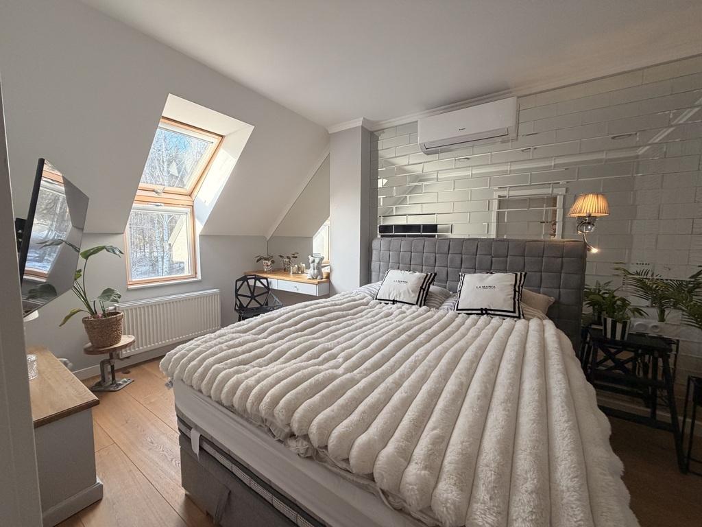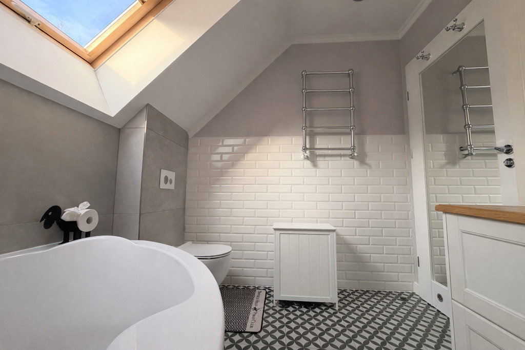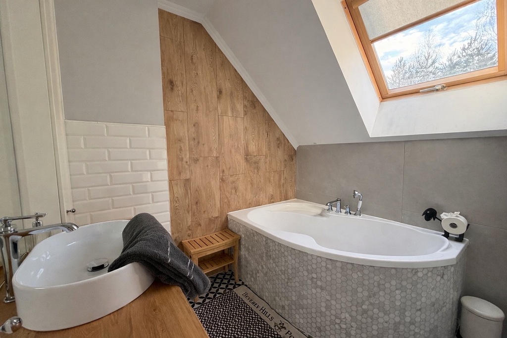 Piętro: sypialnia, drugi pokój, łazienka z wanną